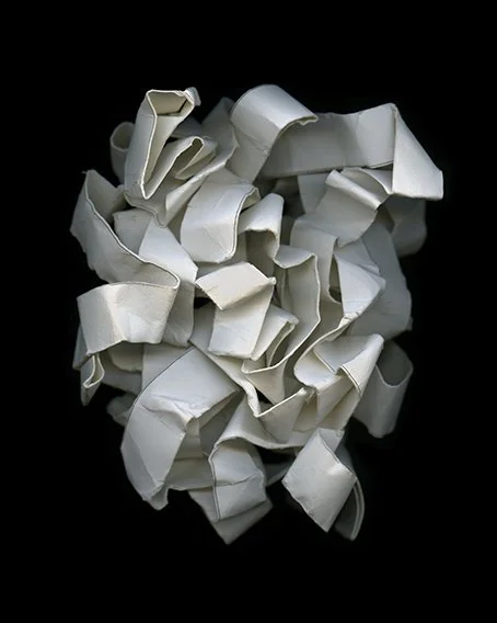 Tethered began as an aggressive act of cutting out and throwing away a series of images. It was a response to what someone else didn't want; it was my answer to being rejected. What I kept were the plain white paper boarders from the series of prints as I couldn't bring myself to destroy everything. I then forced these scraps into shapes (sculpted, balled-up gestures) and offered them back. The results are aesthetic and can be read as a gift or a bow on a package.